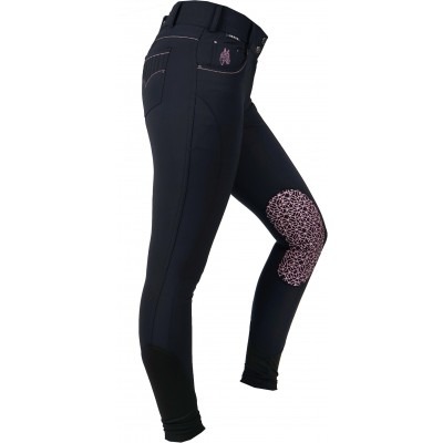 Modieuze rijbroek, gemaakt van technische stof met een geometrische print van siliconen op de knieën. De broek heeft elastische enkelsluitingen en geborduurde accenten op de voor- en achterzakken